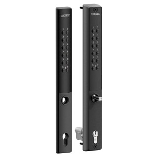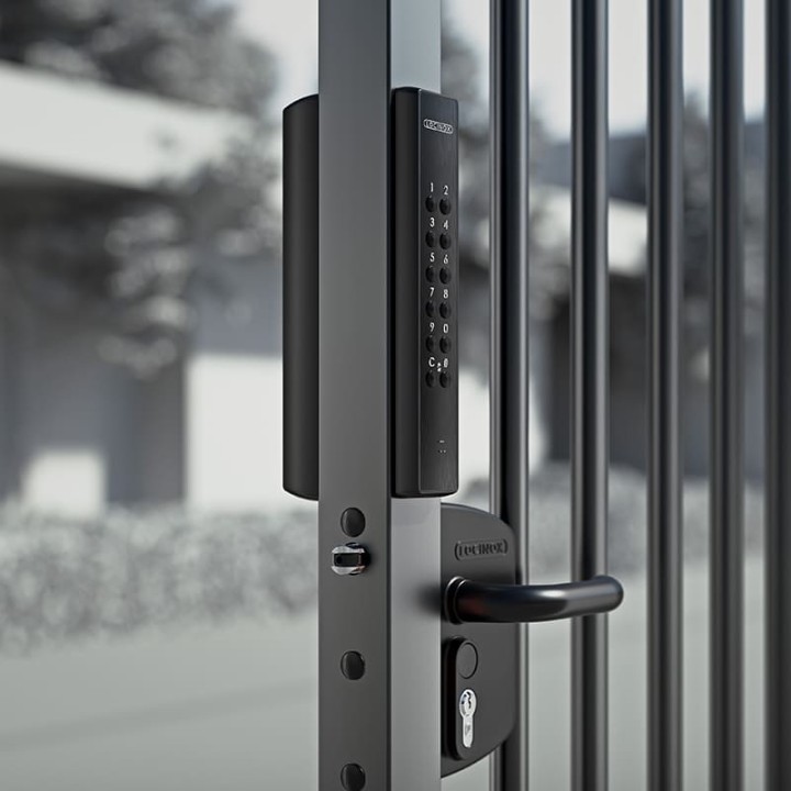 Serrure VOLTA en applique avec clavier à code électronique externe alimenté par batterie.