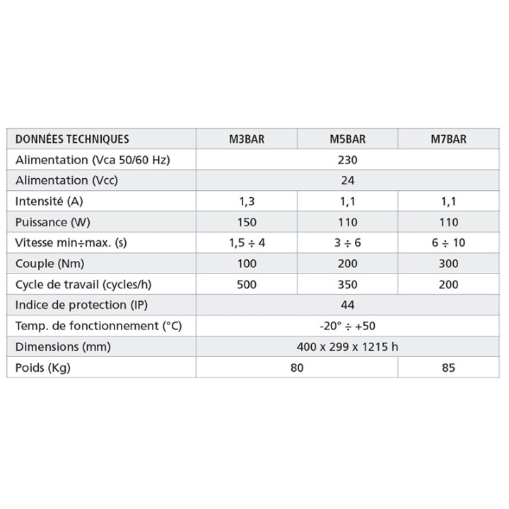 • M5BAR Irréversible 230 Vcc, moteur 24 Vcc, avec plaque de fondation; Avec fût acier traité par catachrèse et laqué.
